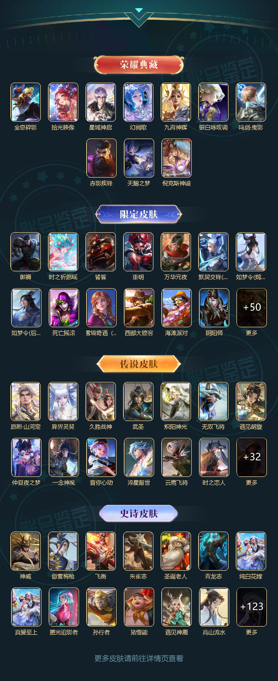 贵族等级V10,英雄数量128,典藏皮肤数10,皮肤数量447,冰锋战神街头霸王天鹅之梦纯白花嫁真爱至上圣诞老人王者之锤凤求凰黄金狮子座全息碎影冰霜恋舞曲青龙志朱雀志太华久胜战神飞衡梁祝倪克斯神谕白鹤梁神女匿光追影者鸣剑·曳影遇见胡旋星域神启武圣孙行者异界灵契神威傲雪梅枪淬星耀世
