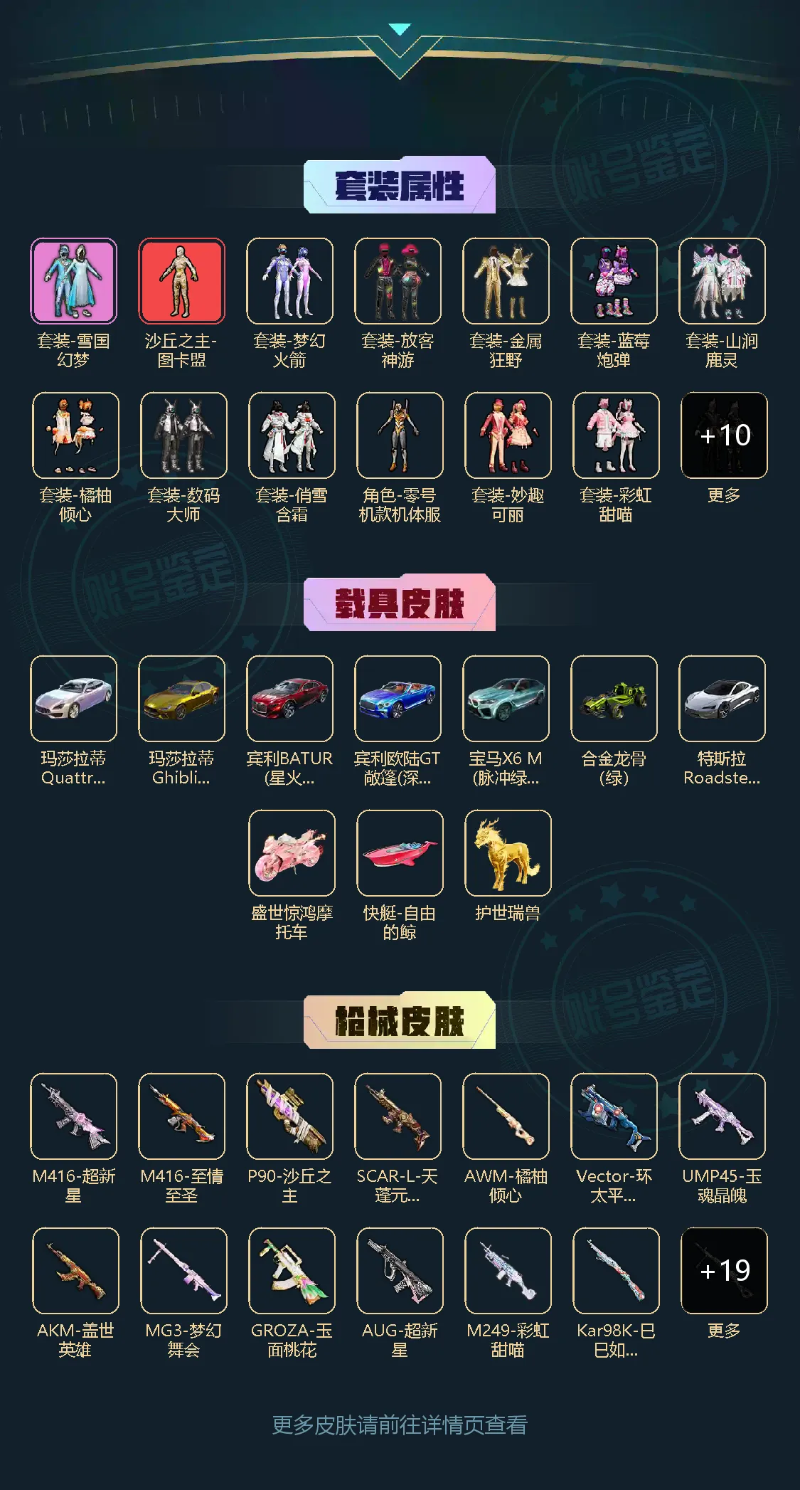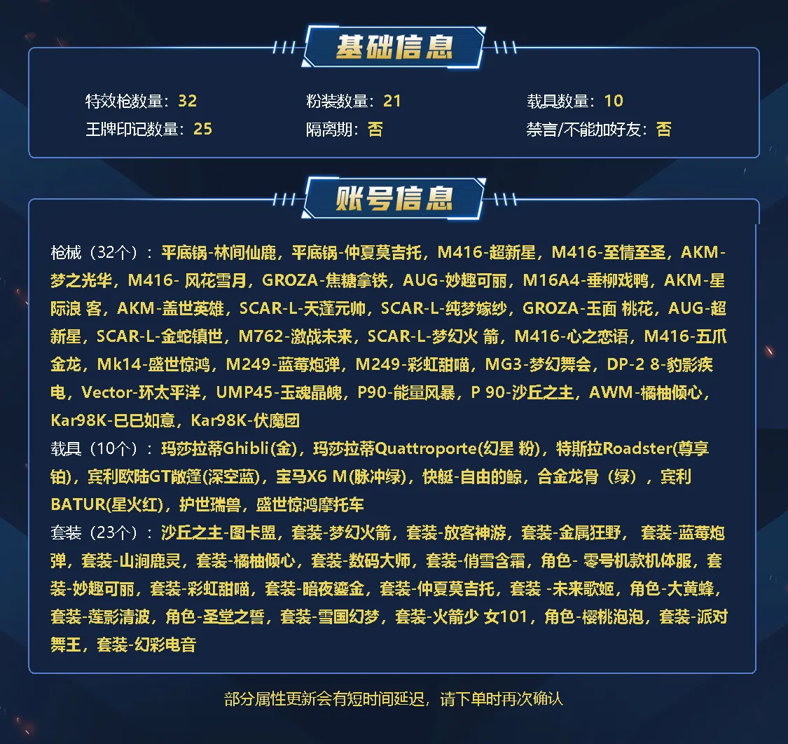 卓越王牌3星21粉,10载具,242套装,25王牌印记,绝世王牌19星历史最高段,172742热力值 平底锅-仲夏莫吉托/平底锅-林间仙鹿/AKM-盖世英雄/SCAR-L-梦幻火箭/M416-风花雪月/M762-激战未来/SCAR-L-天蓬元帅/M416-心之恋语/SCAR-L-纯梦嫁纱/M416-五爪金龙/M16A4-垂柳戏鸭/GROZA-焦糖拿铁/GROZA-玉面桃花/M416-至情至圣/SCAR-L-金蛇镇世/AKM-星际浪客/AUG-妙趣可丽/AUG-超新星/M416-超新星/AKM-梦之光华/Mk14-盛世惊鸿/M249-彩虹甜喵/MG3-梦幻舞会/M249-蓝莓炮弹/DP-28-豹影疾电/P90-能量风暴/Vector-环太平洋/P90-沙丘之主/UMP45-玉魂晶魄/Kar98K-伏魔团/Kar98K-巳巳如意/AWM-橘柚倾心/玛莎拉蒂Ghibli(金)/特斯拉Roadster(尊享铂)/玛莎拉蒂Quattroporte(幻星粉)/宾利欧陆GT敞篷(深空蓝)/宝马X6 M(脉冲绿)/快艇-自由的鲸/合金龙骨(绿)/宾利BATUR(星火红)/护世瑞兽/盛世惊鸿摩托车/